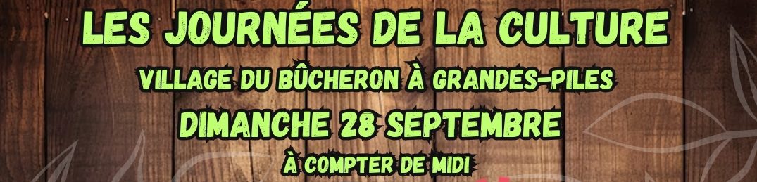 Dans le cadre de la Journée de la Culture, le 28 septembre à partir de midi le Village du Bûcheron va être gratuit et il va y avoir des activités spéciales offertes sur place. Il va y avoir des spectacle de musique de Baptiste Prud’homme avec ses chansons et ses histoires de bûcheron, Kris Kinokewin un chanteur atikamekw et du chanteur Nicolas Pellerin qui va venir chanter des chansons traditionnelles et modernes. Il va aussi y avoir sur place l’artiste-peintre Gallia Julie-Myrand et les jardins des grisettes.